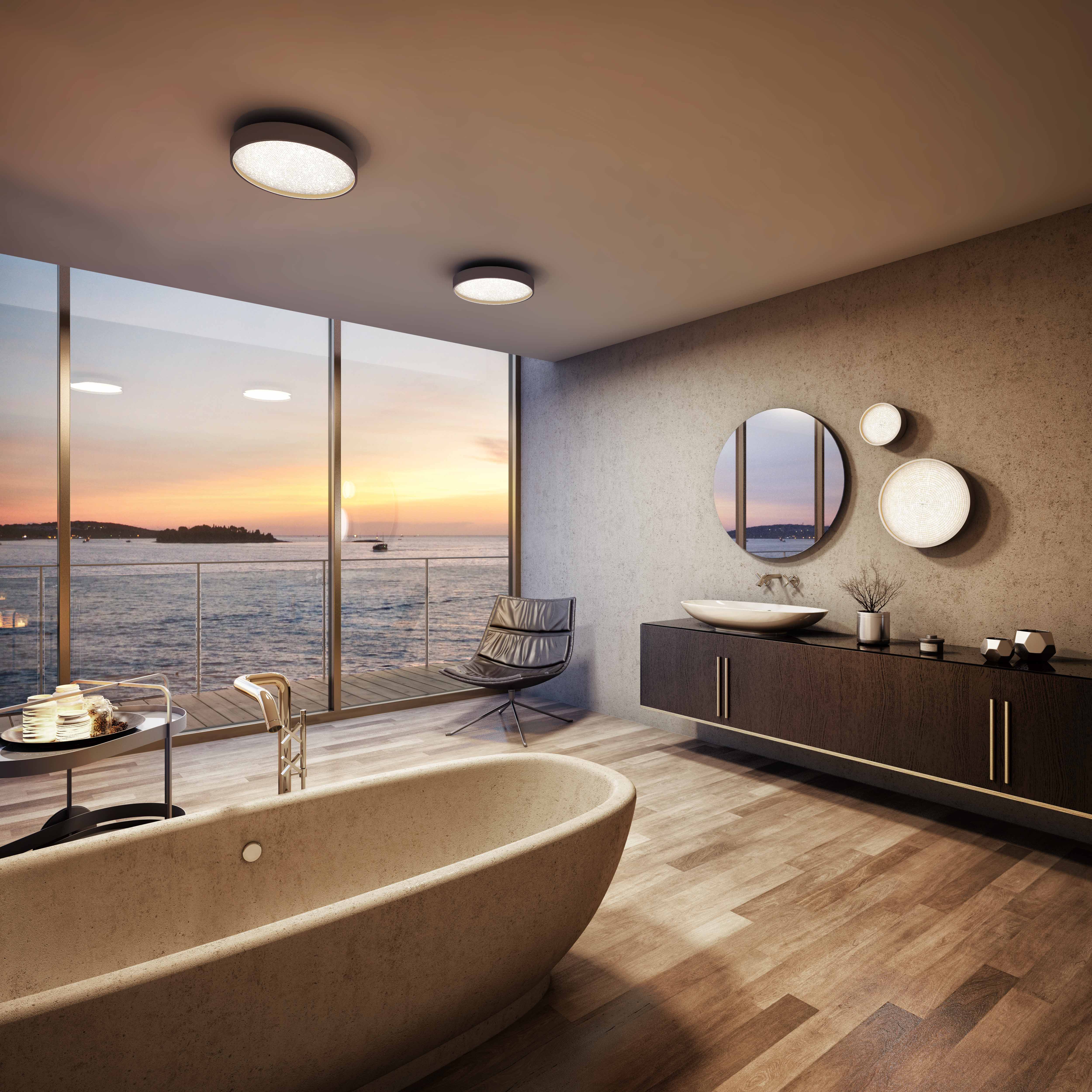 The elegant SIGN Diva surface-mounted luminaire - for wall and ceiling mounting - is now also available in a protected version for covered outdoor areas and wet rooms. Thanks to its special design, the IP54-standard luminaire is protected against the ingress of dirt and water from all sides.