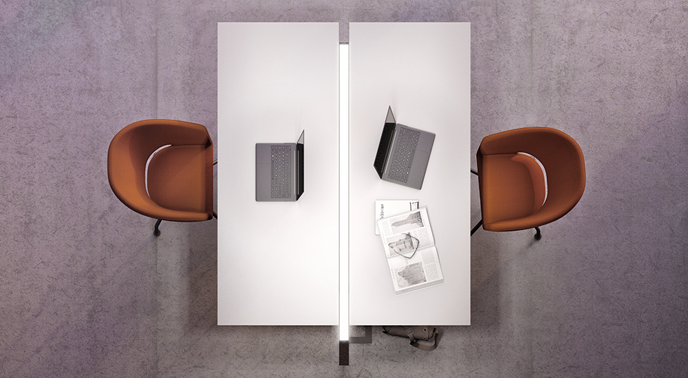 The diffuse light source, shielded by a glare-free micro-prismatic screen, emulates the natural light in cloudy weather situations and at the beginning and end of the day, when the sun is lower on the horizon. This light scenario associated with a more relaxed mood, stimulating creativity and social activities..