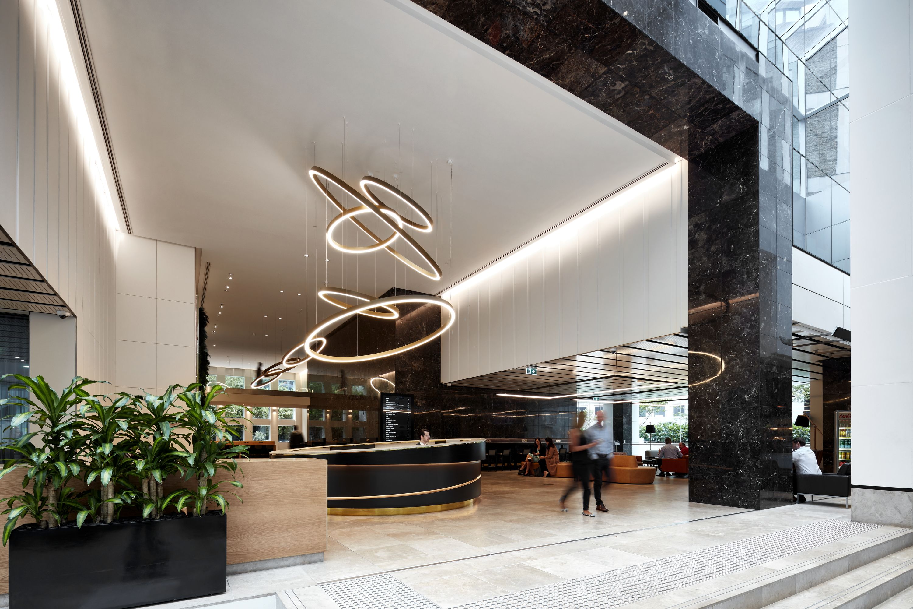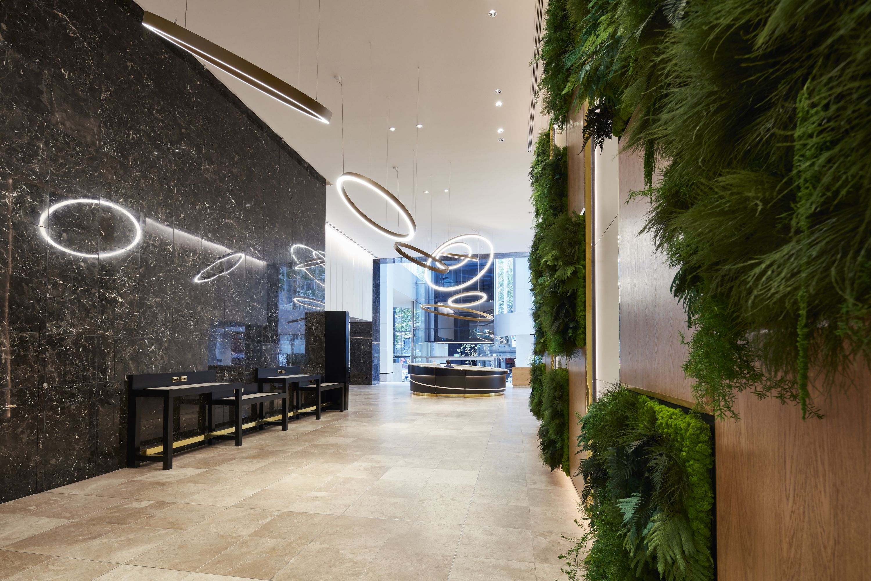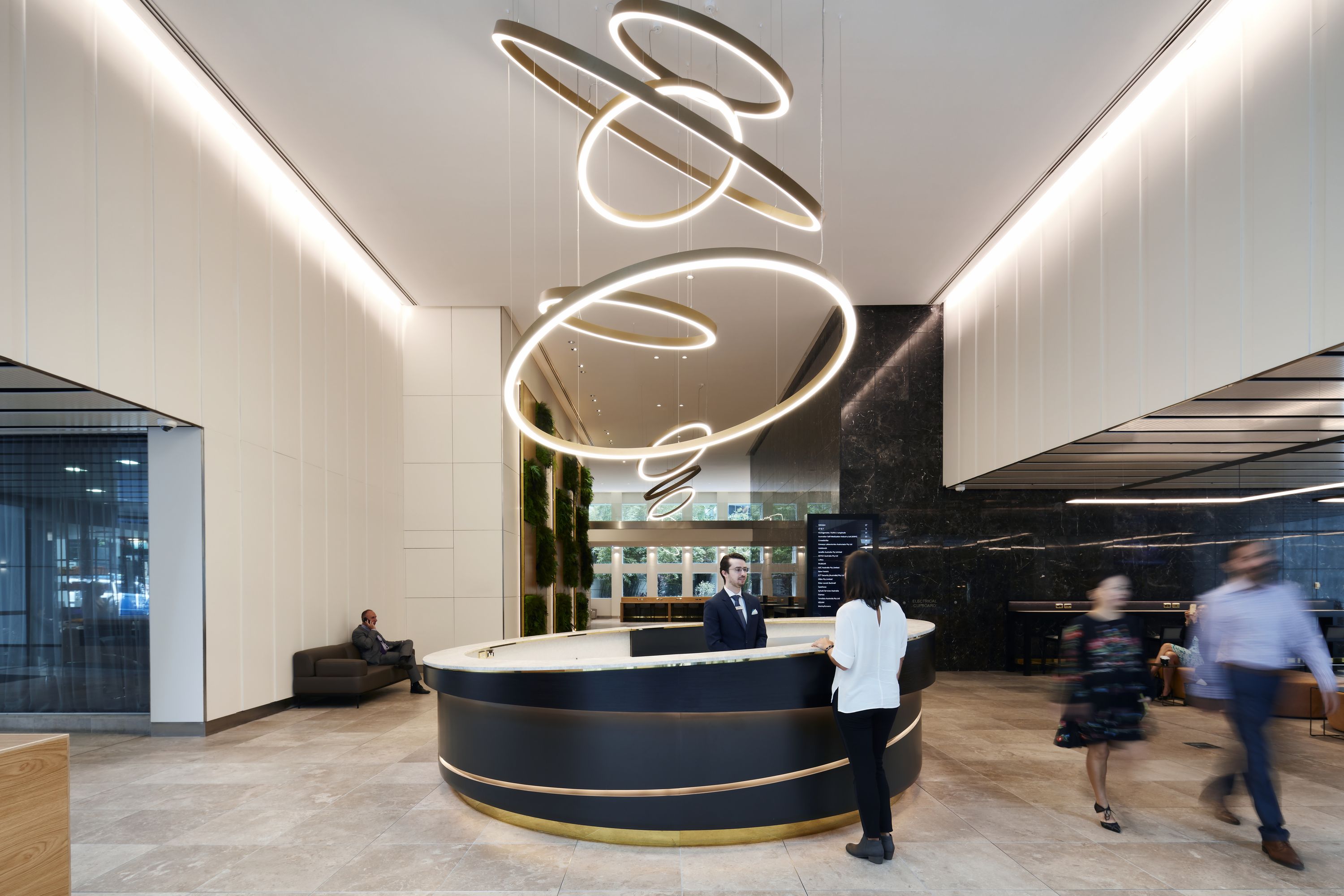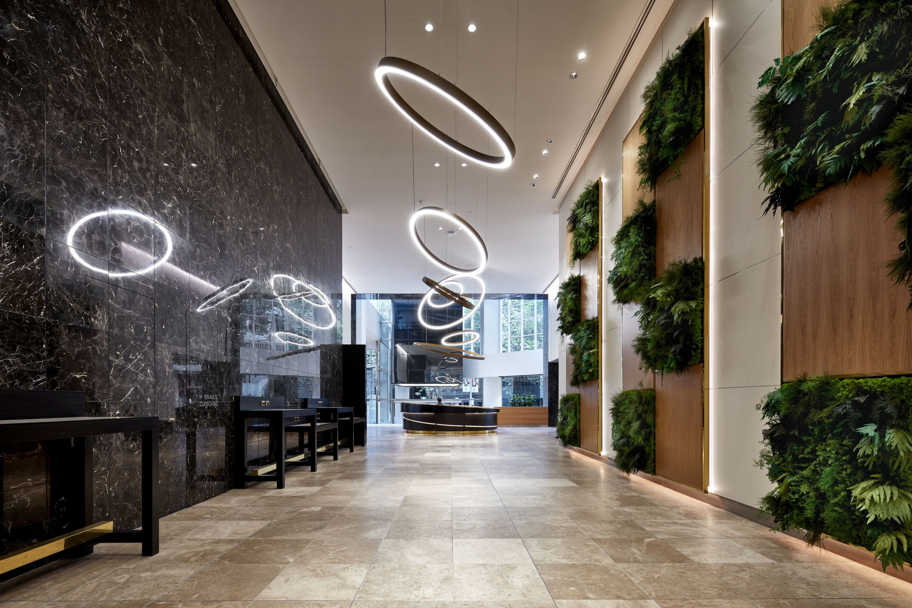 Just as you enter the skyscraper, you will notice the particularly luxurious design and the high-quality materials - the entire atmosphere of the room leaves no doubt about the big business in it. The extensive lobby of the prestigious building also offers a special eye-catcher: a unique suspension and arrangement of GLORIOUS luminaires in the colour 24 Golden Heart makes the public area of 141 Walker Street an architectural highlight.