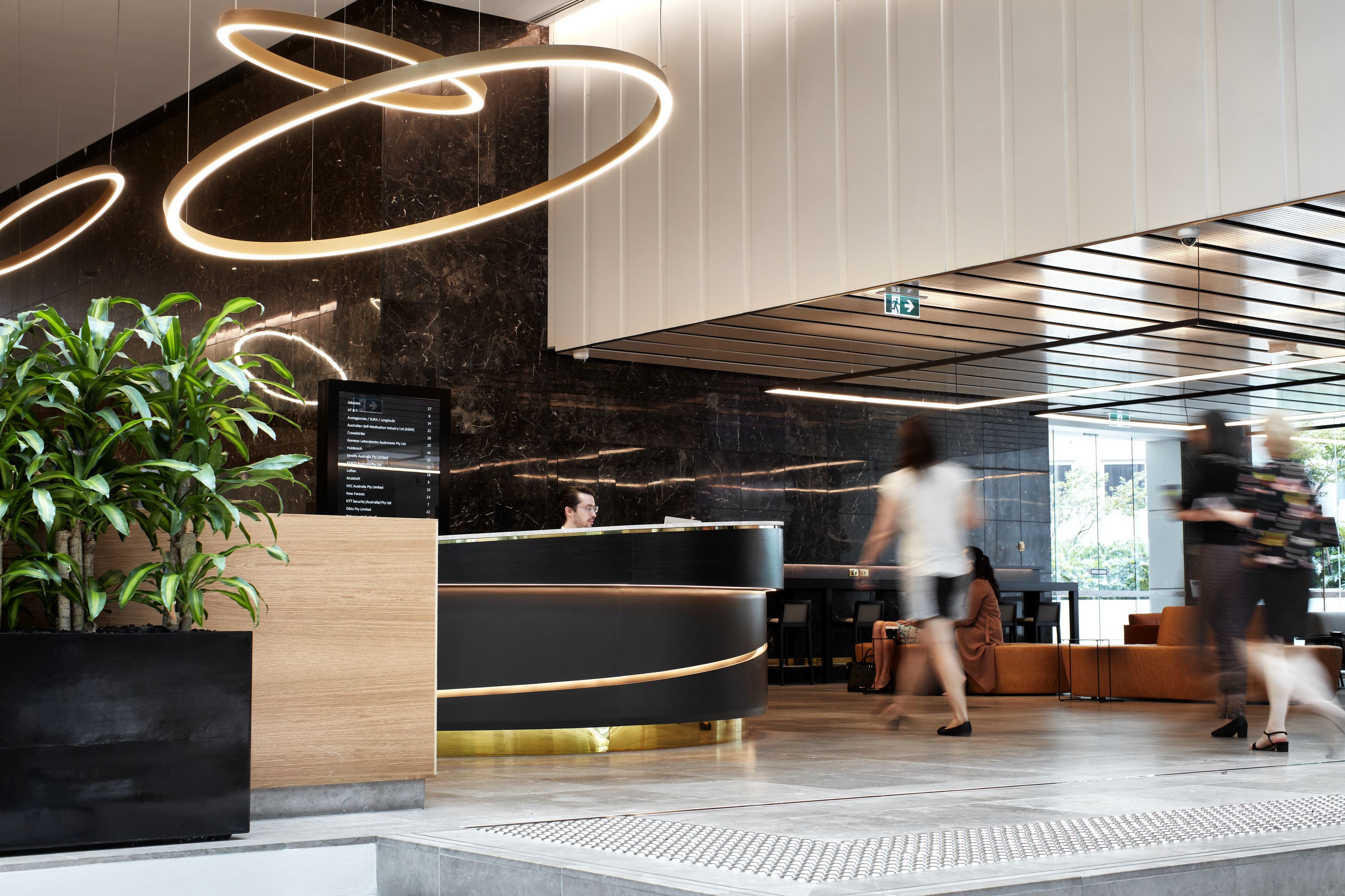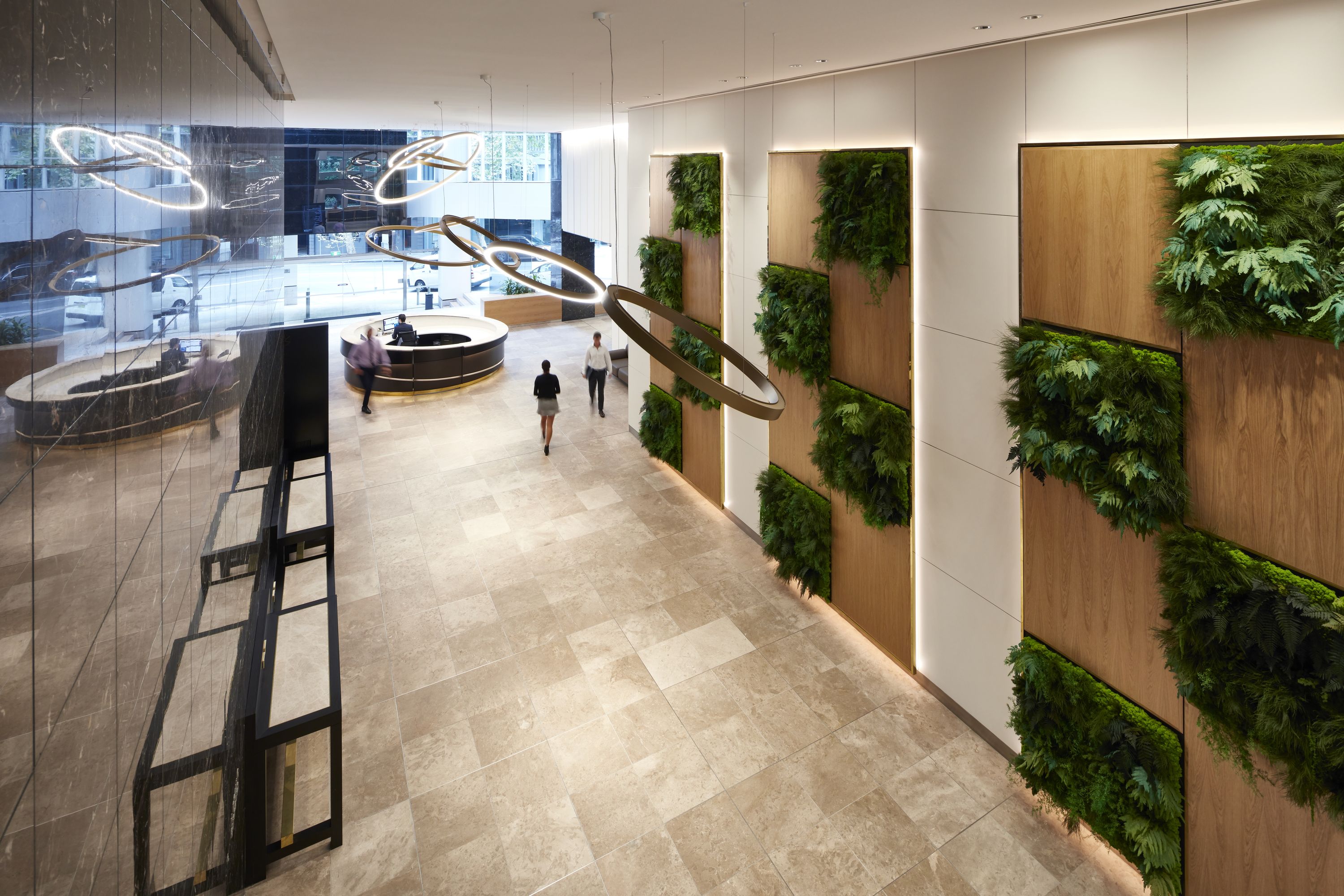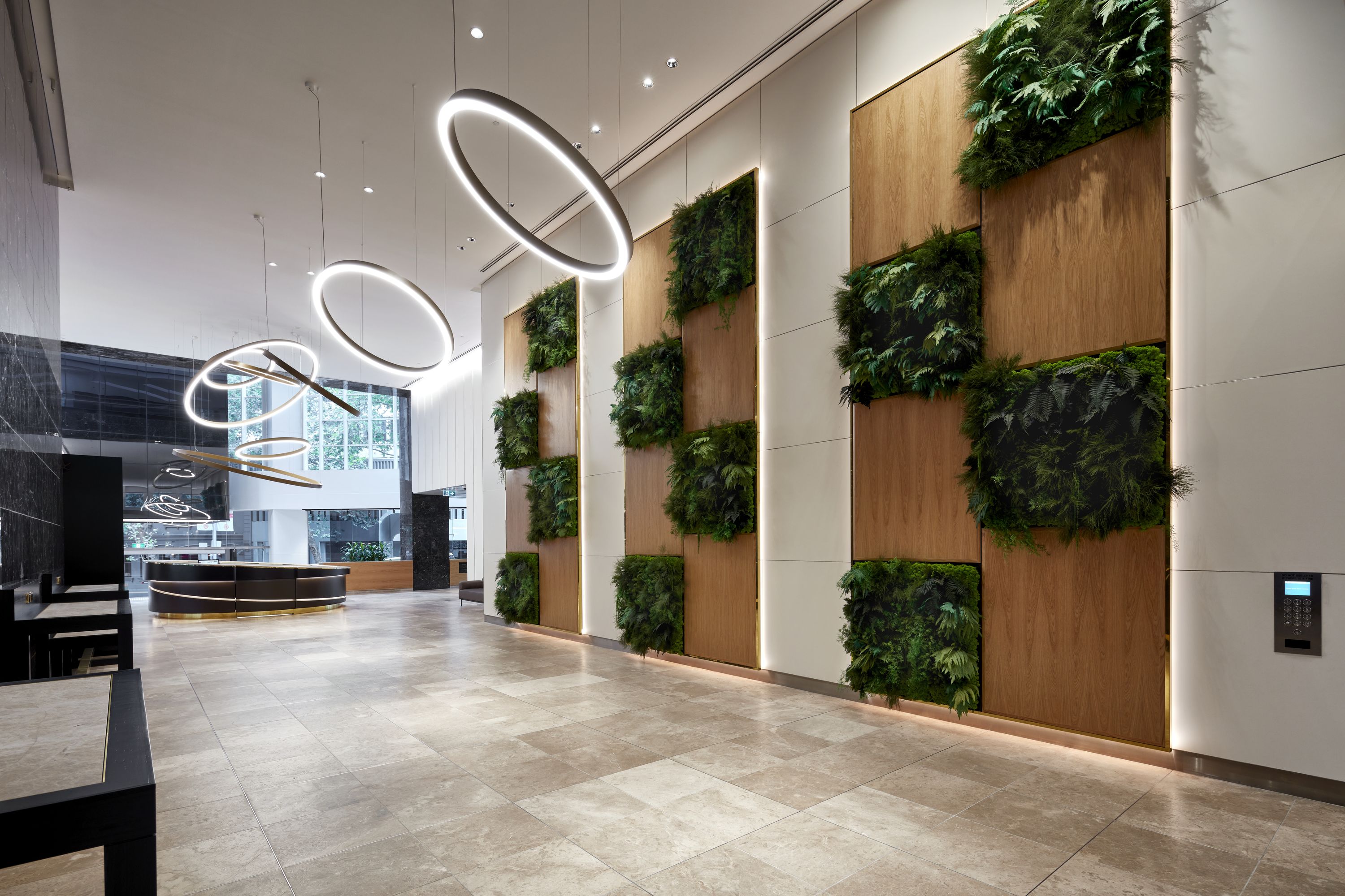 Just as you enter the skyscraper, you will notice the particularly luxurious design and the high-quality materials - the entire atmosphere of the room leaves no doubt about the big business in it. The extensive lobby of the prestigious building also offers a special eye-catcher: a unique suspension and arrangement of GLORIOUS luminaires in the colour 24 Golden Heart makes the public area of 141 Walker Street an architectural highlight.