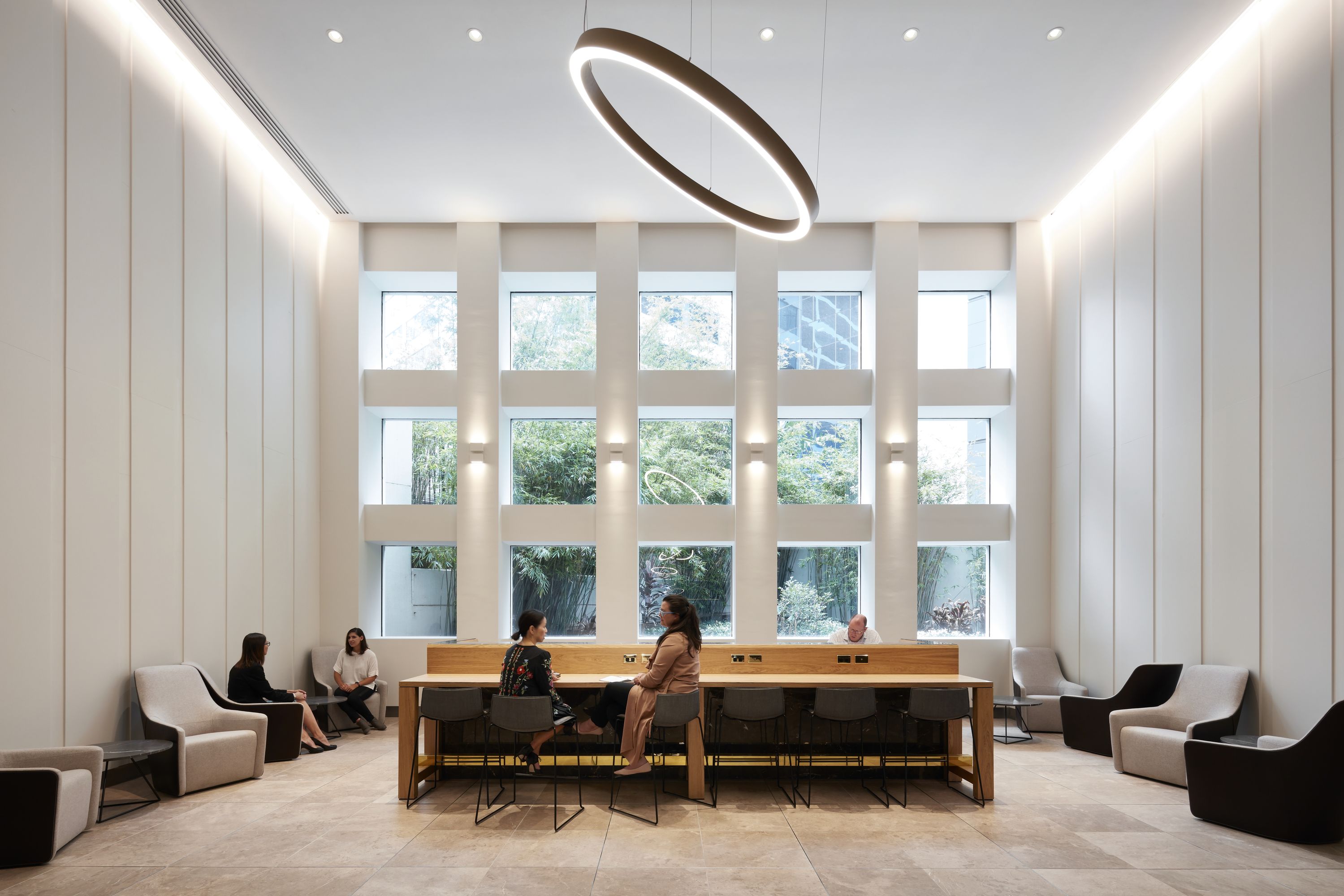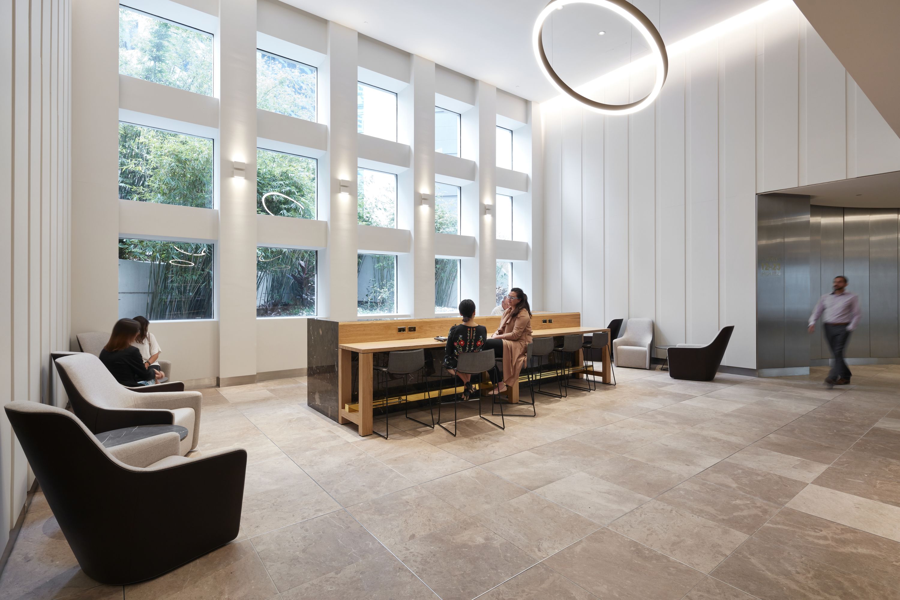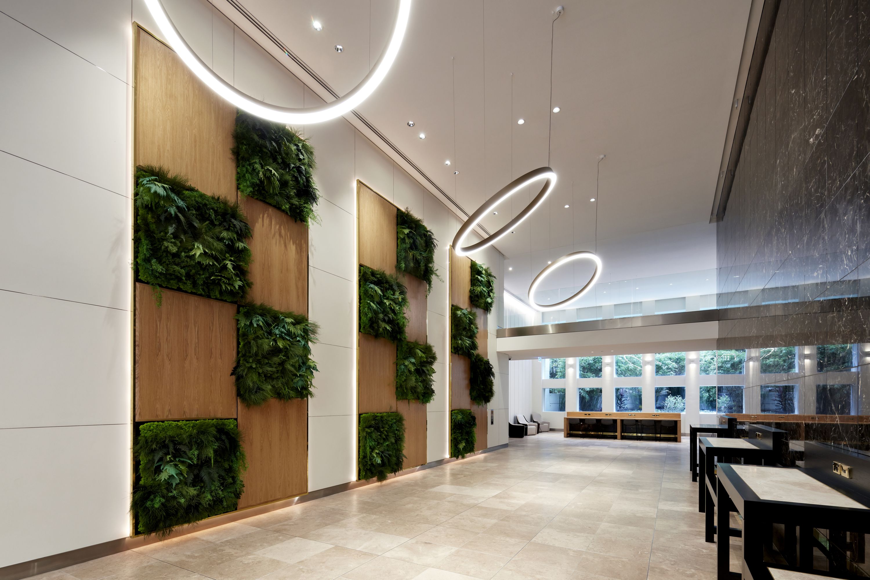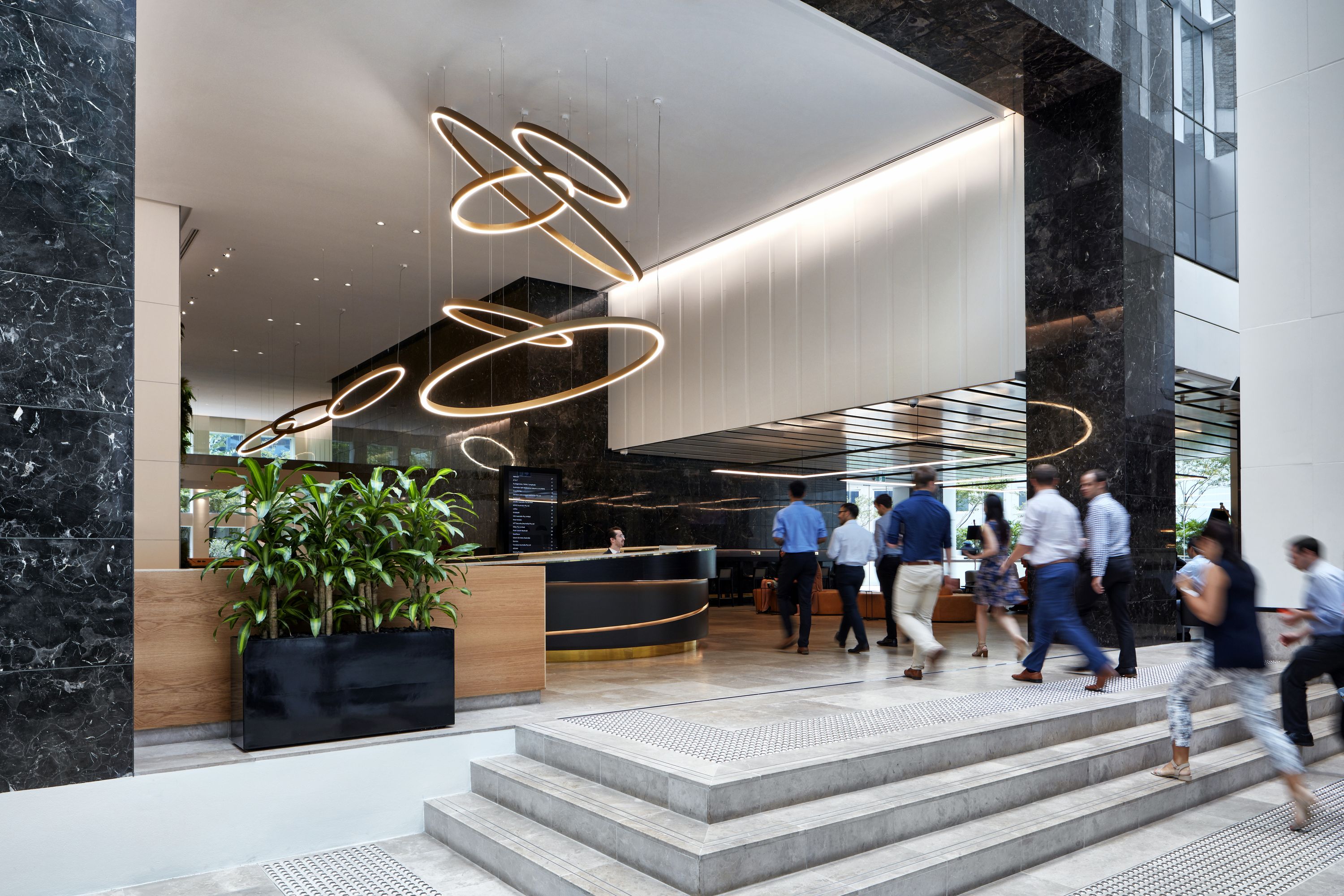 Just as you enter the skyscraper, you will notice the particularly luxurious design and the high-quality materials - the entire atmosphere of the room leaves no doubt about the big business in it. The extensive lobby of the prestigious building also offers a special eye-catcher: a unique suspension and arrangement of GLORIOUS luminaires in the colour 24 Golden Heart makes the public area of 141 Walker Street an architectural highlight.