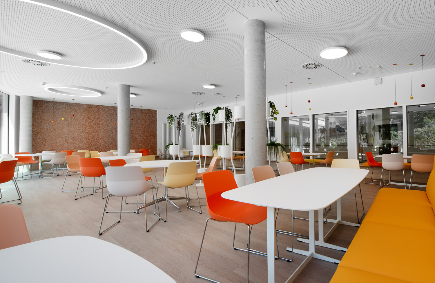 The Super G, Sign, Snooker und Glorious luminaires seamlessly integrate into the design concept, providing dynamic and flexible illumination. Their form enhances the fluid spatial structures, reinforcing the interplay of light, color, and materiality. Through precise lighting accents, bright and welcoming areas offer orientation, while intimate retreats are subtly highlighted.
