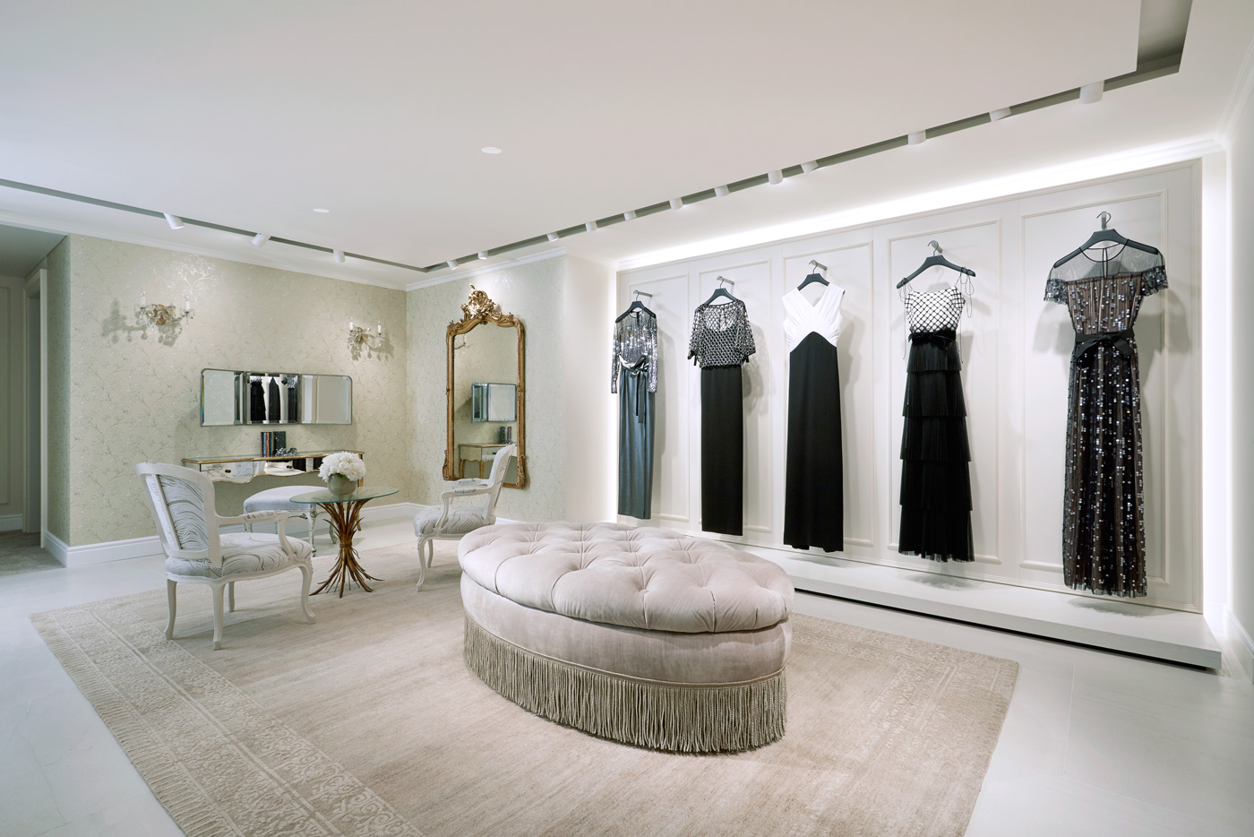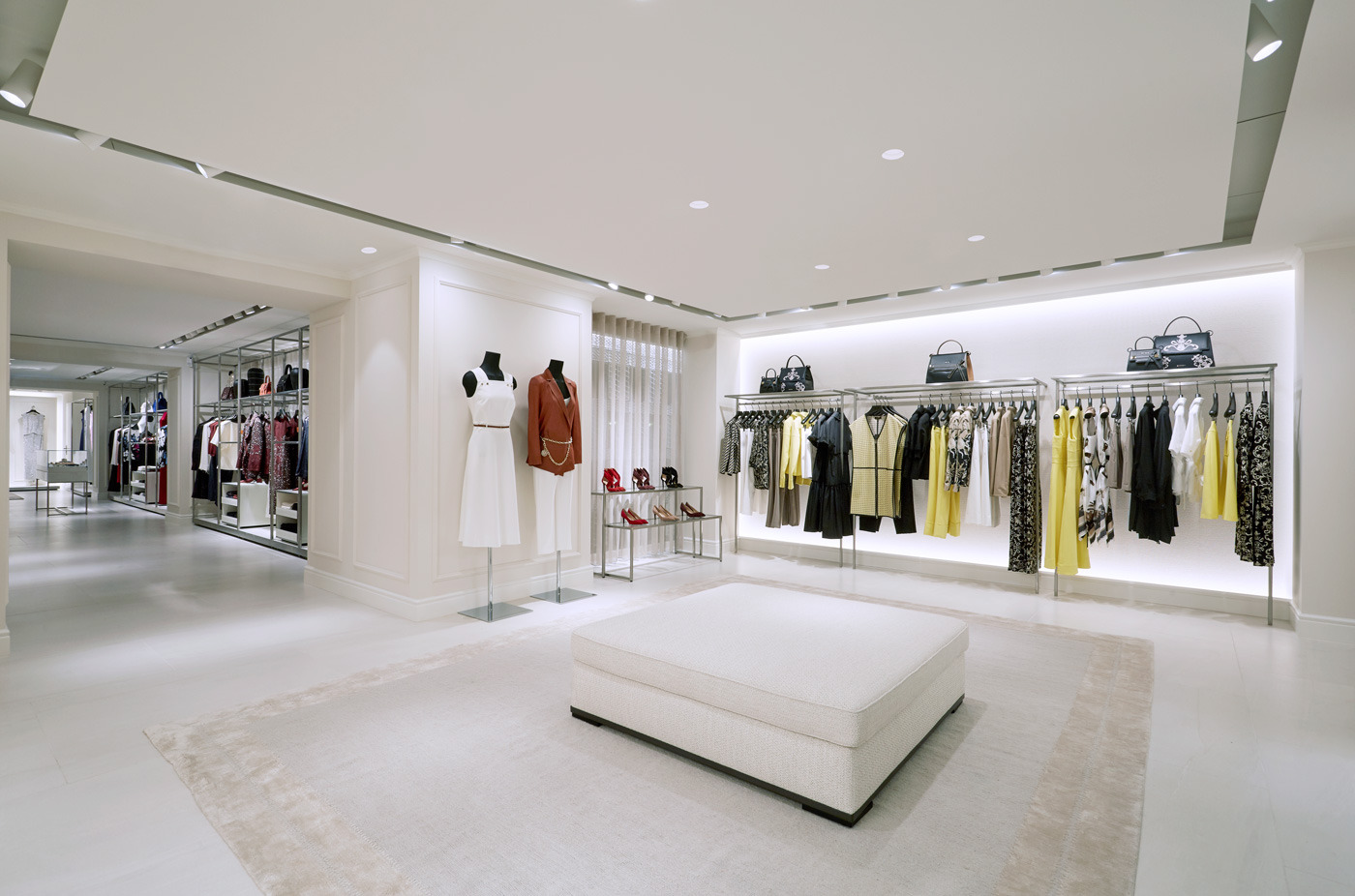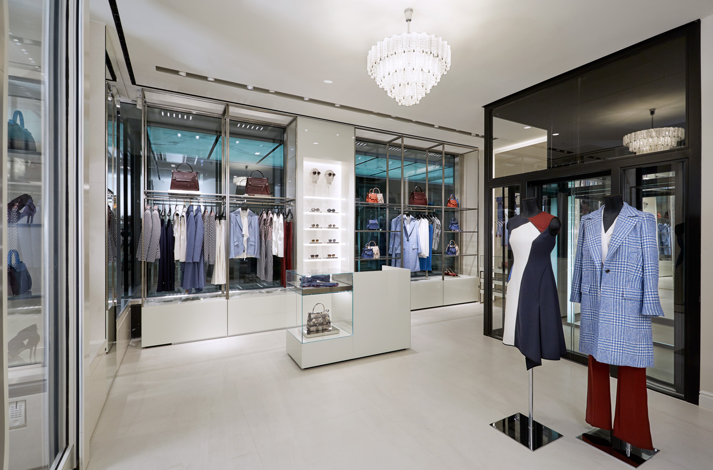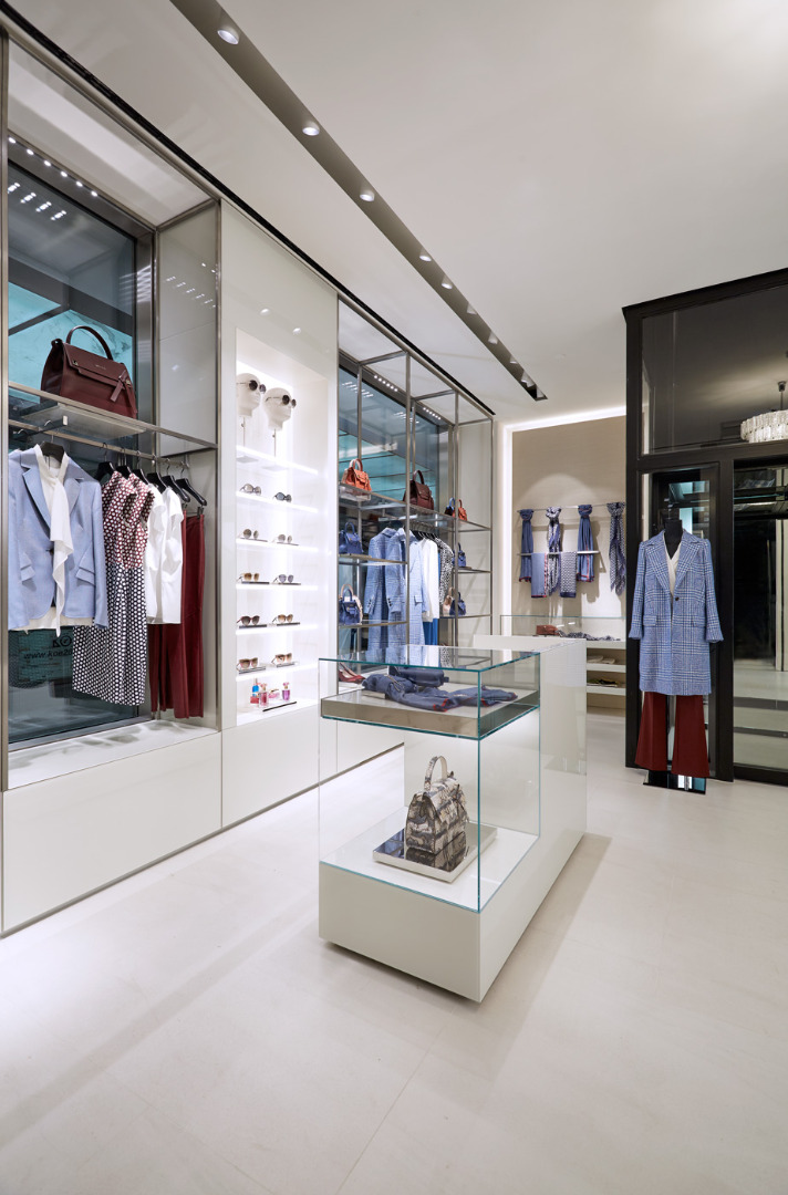 Escada stands for modern elegance, glamour and sensual femininity. The new design concept provides the perfect framework for this: the 230m2 shop in Düsseldorf’s Königsallee is reminiscent of a stylish, private sitting room with a lounge feeling ­– intimate and yet inviting. The two-storey retail space is divided into various sections, such as ready-to-wear, accessories or evening wear. Each of the interconnected rooms has an unmistakeable decor style, in which antiques are combined with contemporary pieces. Selected works of art and carefully staged details such as glass chandeliers, mirrors or a marble fireplace draw the gaze. The peaceful, neutral palette of cream, beige and warm white forms the perfect background for the exclusive colours and prints of the Escada collection.
