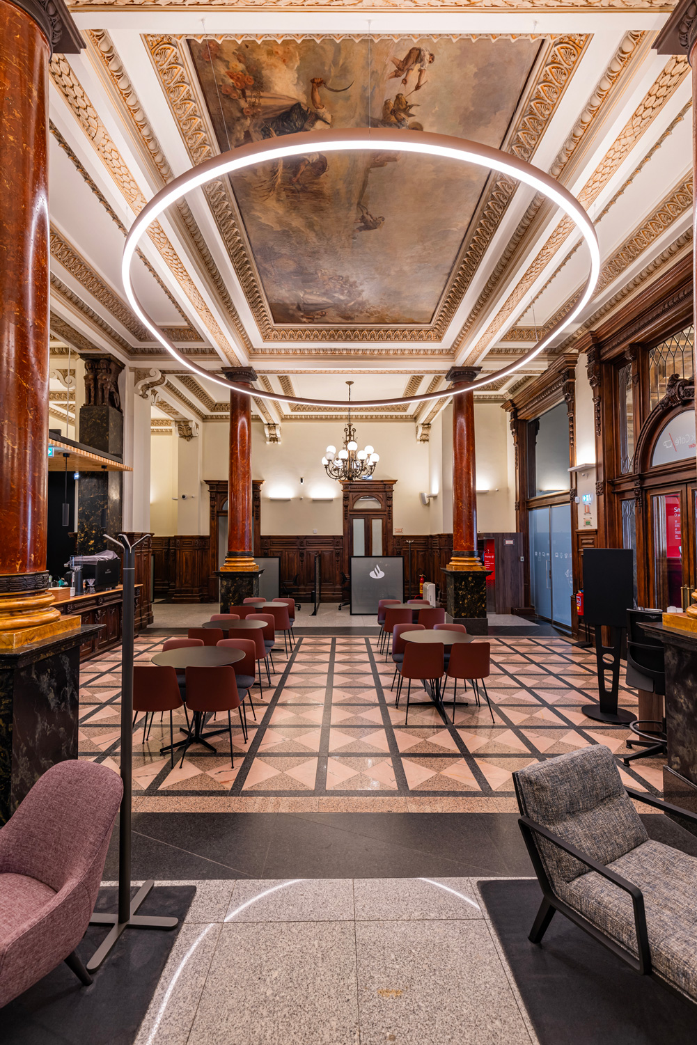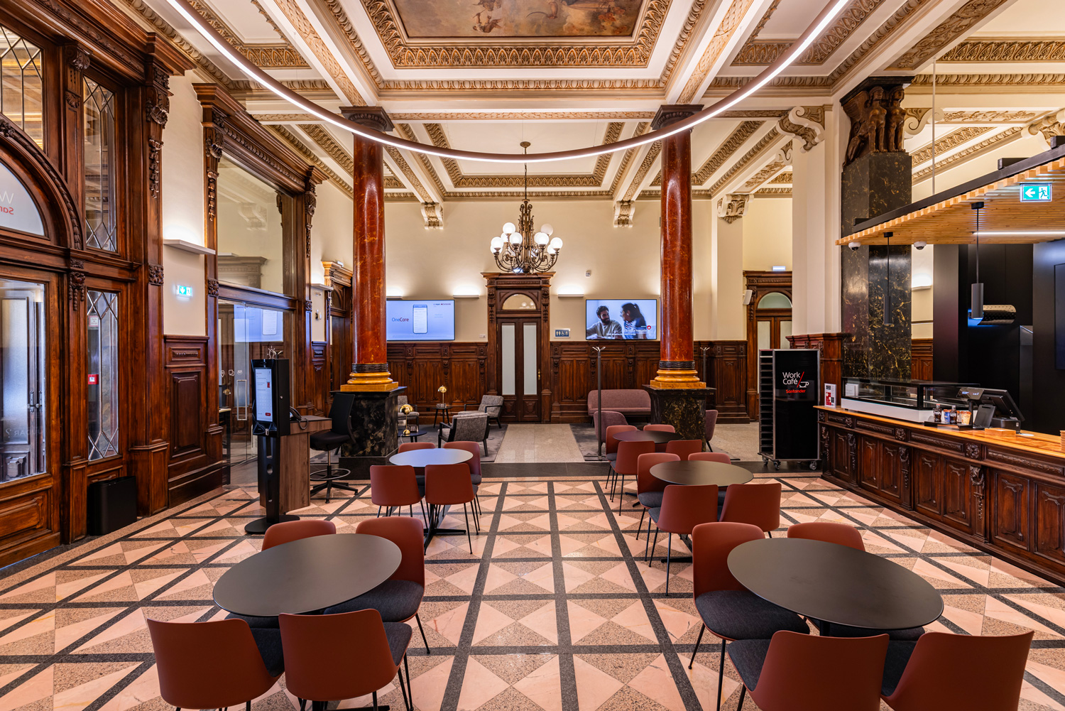 The Santander Work Café concept combines co-working, cafeteria, and banking services in an open, inviting environment for both customers and non-customers. In Porto, PROLICHT luminaires GLORIOUS SLIM, SPEED WALL, and HYPRO F shape the atmosphere, delivering flexible lighting that highlights architecture, enhances comfort, and supports the café’s multifunctional character.