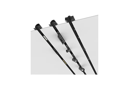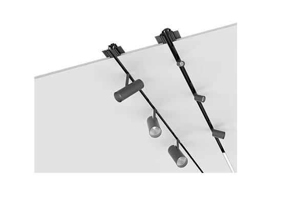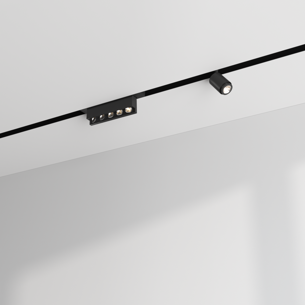 A hybrid solution with spots and general lighting is possible with the 2LOOK4 profile 25 range. Adjustable spotlights in three sizes (ø 30-40-60 mm) with different lenses and lumen packages can be magnetically installed on the MAGTRACK, ensuring tool-free mounting and repositioning. The inner side of the knife-edge extruded profile with a visible opening of 25 mm is fitted with 48 V conductors and is always black inside. A DC line still offers full control of individual track luminaires by sending commands via the DC power lines.