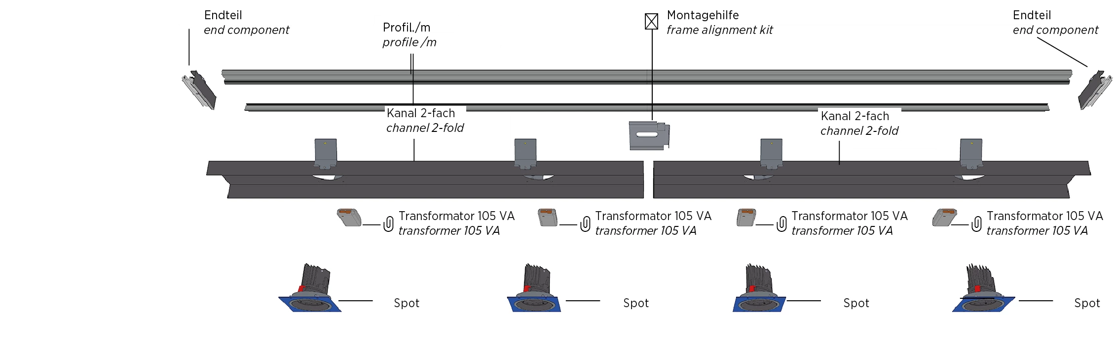 The all-rounder of the 2LOOK4 family combines the advantages of the minimalist knife-edge profile system with additional integrable features. In addition to the seamlessly integrated and adjustable BIONIQ luminaires, it is also possible to integrate audio systems or air conditioning systems. The wide opening of 160 millimeters allows easy installation and maintenance - all connections are accessible at all times.