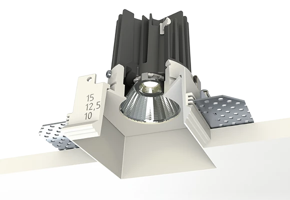 The trimless CAVE range (single or double spot, or asymmetrical for vertical illumination) and the recessed 4DI downlight are both characterised by a deep inset for enhanced visual comfort. The housing and inset can be finished in one of the 25 PROLICHT colours. An adjustable mounting system allows the trimless CAVE to be installed in 10, 12.5 or 15 mm plasterboard.