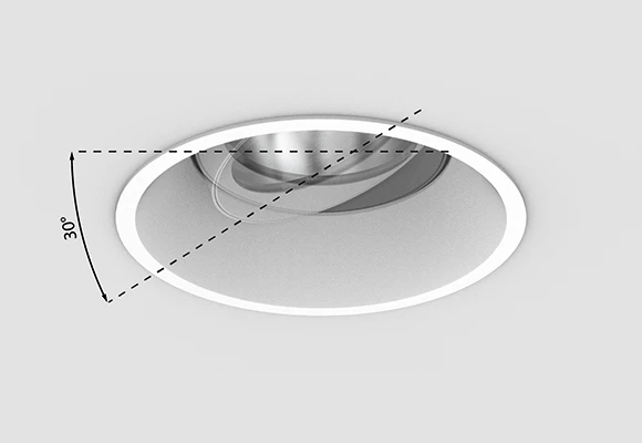 The COMFORT range is characterized by a deeper recessed unit with a higher tilting point. The moving part of the unit is discreetly integrated into the ceiling when set at a tilted positio, achieving a higher level of visual comfort with better glare reduction. Up to 355° rotation and 30° tilt are possible. COMFORT is available in sizes M and L. In M, the spot is recessed by 30 mm, and by 48 mm in L.