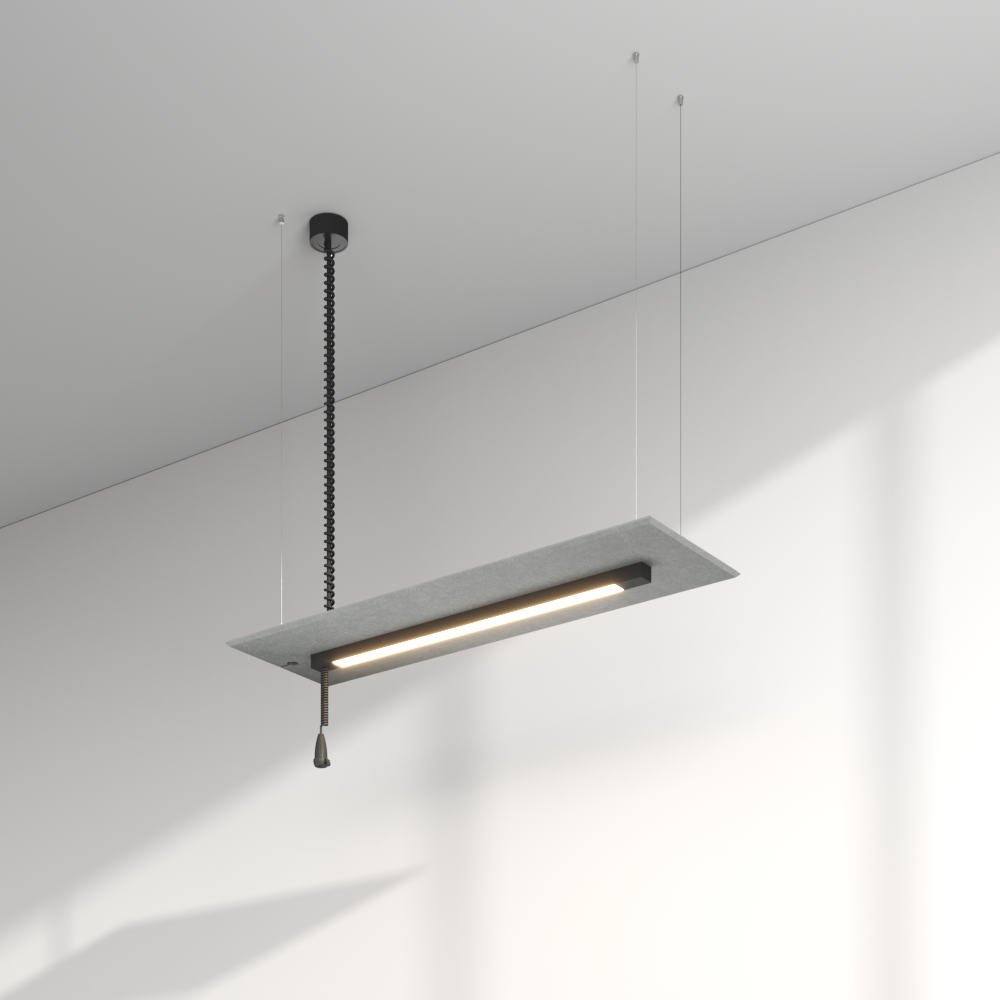 PLUQ IN goes beyond light, it is a hybrid infrastructure: it provides light, it improves acoustic comfort, and it brings electrical power exactly where you need it. Light and silence, plugged into design.