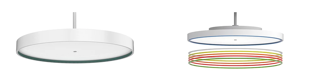 Well-defined openings at the top of the surface mounted SIGN series emphasise a decorative AURA light effect up towards the ceiling. The choice of 6 integrated colored diffusers (red, green, blue, yellow, orange, white) allows the architect the create a floating light effect. The PPMA-covered LED openings on the top plate are designed in such a way as to ensure perfect DIRECT/INDIRECT illumination (50%-50%) for additional emphasis of the ceiling.