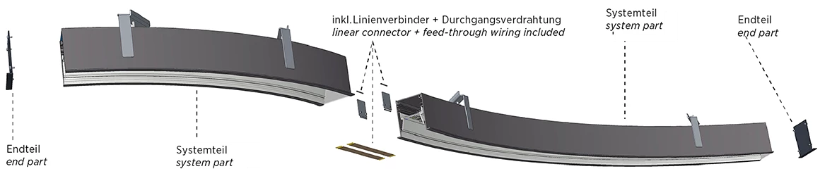 A dynamically flowing line of light. The SUPER-G SLIM recessed profile system draws elegant, curvy lines on ceilings and walls that provide powerful and uniform lighting. Different curve elements and lengths in standard sizes or customized sizes offer a lot of creative scope. The entire internal unit with reflector, driver and LED board can be changed easily